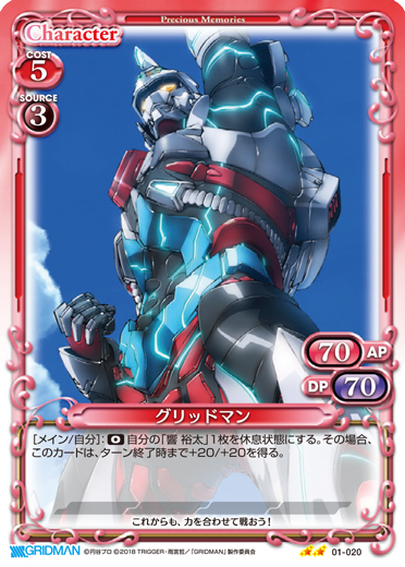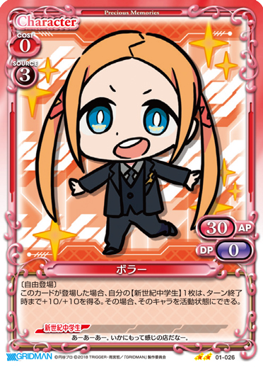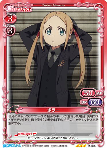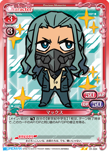 | [メイン/自分]:《休》自分の【新世紀中学生】1枚は、ターン終了時まで、このカードのAP/DPと同じ値のAP/DPの修正を得る。 | ||