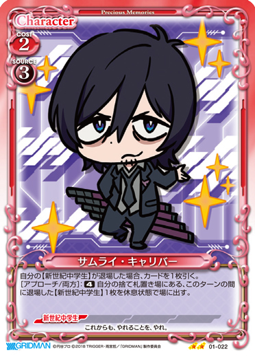 | 自分のキャラのアプローチで相手のキャラが退場した場合、使用コストが自分の【新世紀中学生】の枚数以下の相手のキャラ1枚を休息状態にする。 | ||