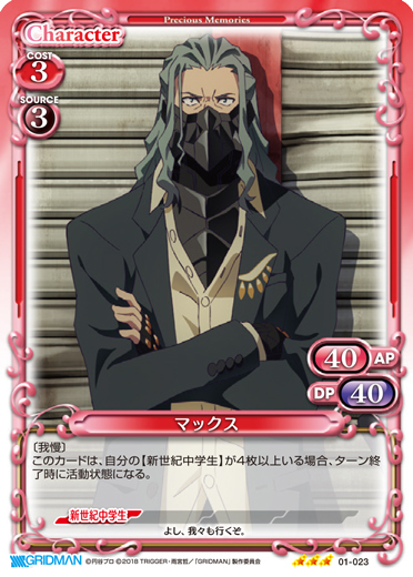 | 〔我慢〕このカードは、自分の【新世紀中学生】が4枚以上いる場合、ターン終了時に活動状態になる。 | ||