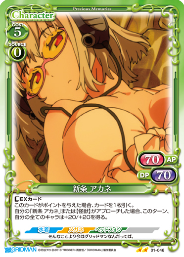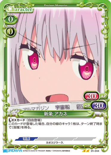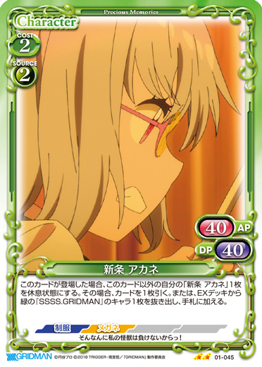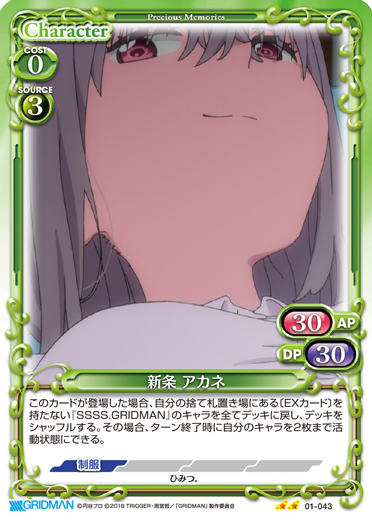 | このカードが登場した場合、このカード以外の自分の「新条 アカネ」1枚を休息状態にする。その場合、カードを1枚引く。または、EXデッキから緑の『SSSS.GRIDMAN』のキャラ1枚を抜き出し、手札に加える。 | ||