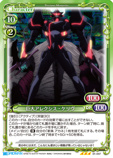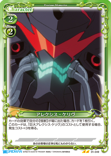 | カードの効果で自分の【怪獣】が場に出た場合、カードを1枚引く。このカードは、「巨大アレクシス・ケリヴ」のコストとして使用する場合、発生コスト+3を得る。 | ||