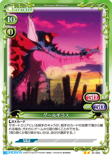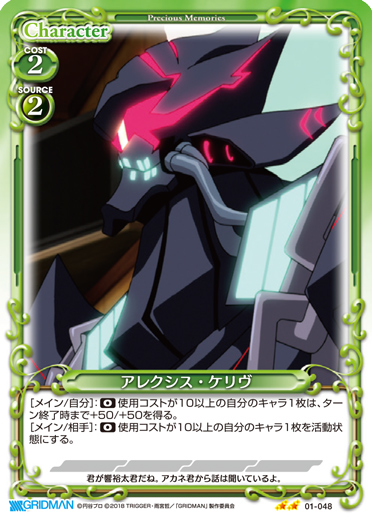 | このカードが登場した場合、自分の捨て札置き場にある〔EXカード〕を持たない『SSSS.GRIDMAN』のキャラを全てデッキに戻し、デッキをシャッフルする。その場合、ターン終了時に自分のキャラを2枚まで活動状態にできる。 | ||