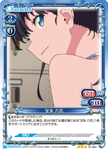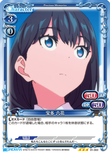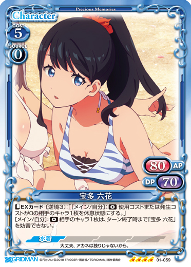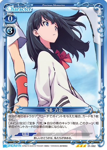 | [メイン/自分]:《0》自分の「宝多 六花」1枚は、ターン終了時まで、APまたはDPが100以上のキャラには妨害されない。 | ||