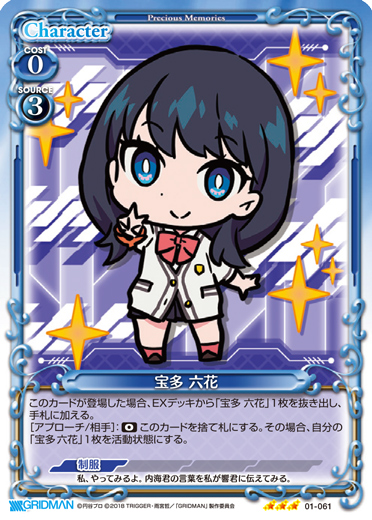 | 〔アクティブ〕このカードは、使用コストまたは発生コストが0のキャラには妨害されない。自分の「宝多 六花」がアプローチしている間、相手は、キャラを活動状態にすることができず、キャラを登場させることができない。 | ||