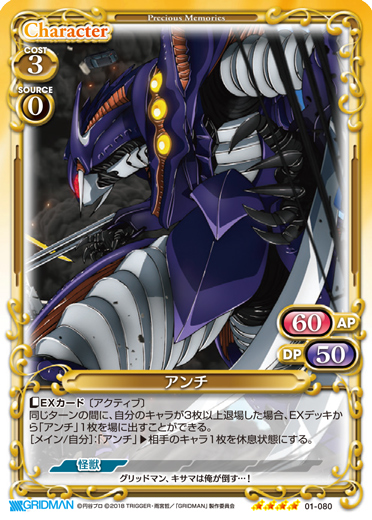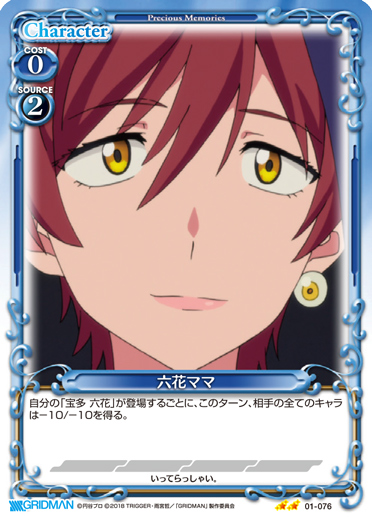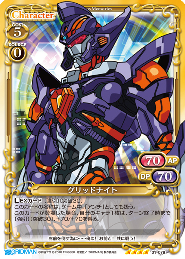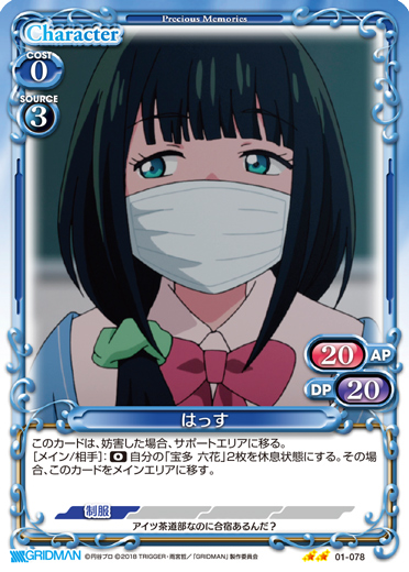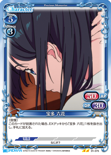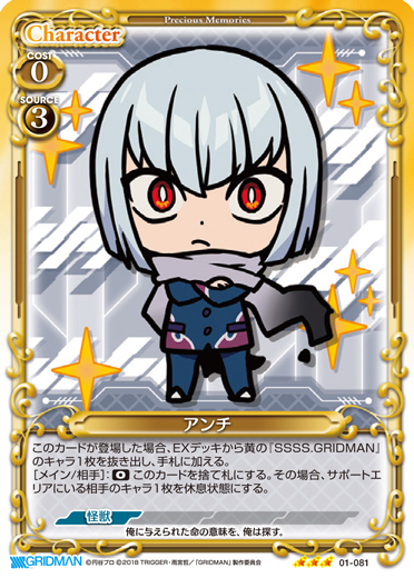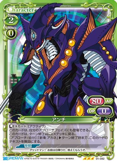 | このカードが登場した場合、EXデッキから黄の『SSSS.GRIDMAN』のキャラ1枚を抜き出し、手札に加える。[メイン/相手]:《0》このカードを捨て札にする。その場合、サポートエリアにいる相手のキャラ1枚を休息状態にする。 | ||