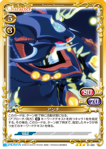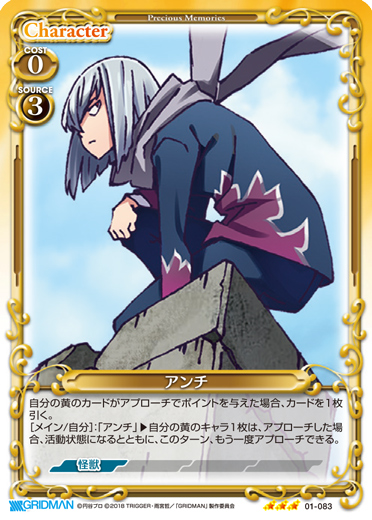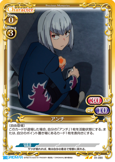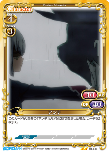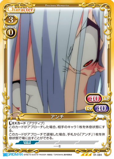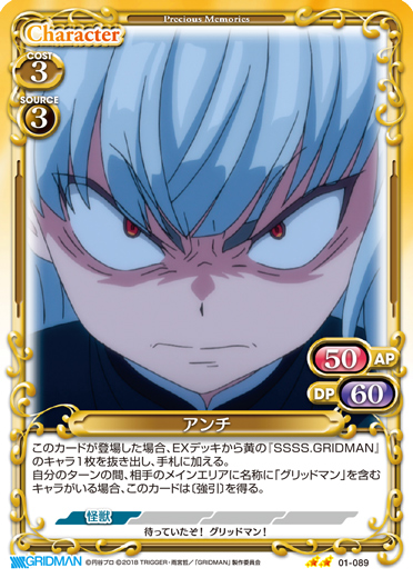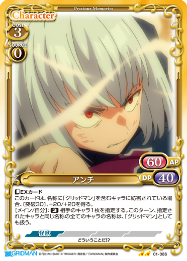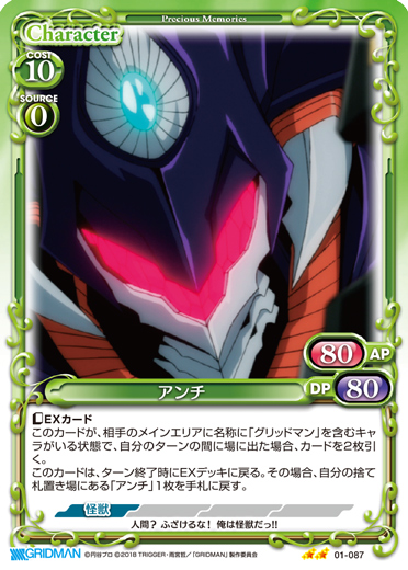 | 〔EXカード〕このカードが、相手のメインエリアに名称に「グリッドマン」を含むキャラがいる状態で、自分のターンの間に場に出た場合、カードを2枚引く。このカードは、ターン終了時にEXデッキに戻る。その場合、自分の捨て札置き場にある「アンチ」1枚を手札に戻す。 | ||