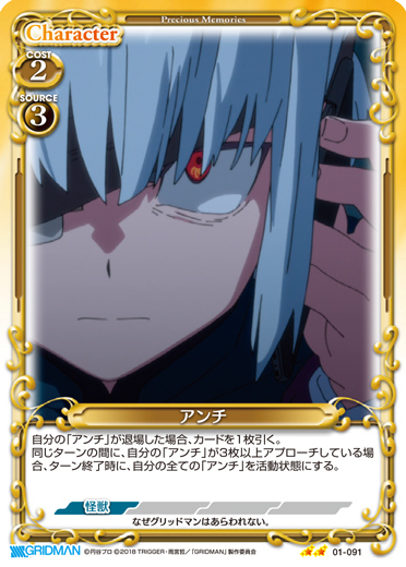 | 自分の「アンチ」が退場した場合、カードを1枚引く。同じターンの間に、自分の「アンチ」が3枚以上アプローチしている場合、ターン終了時に、自分の全ての「アンチ」を活動状態にする。 | ||
