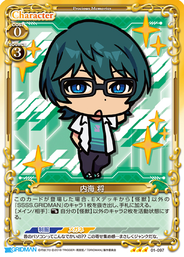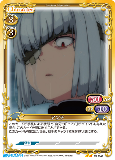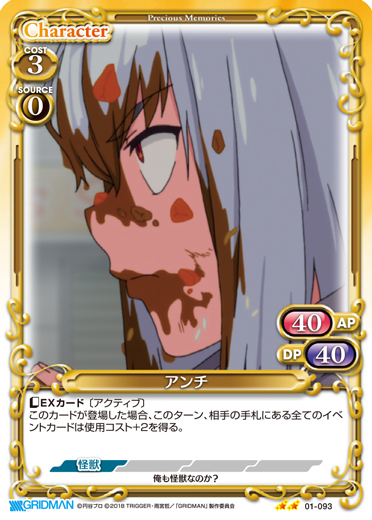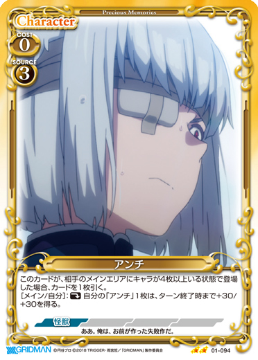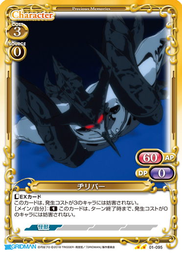 | このカードが登場した場合、EXデッキから【怪獣】以外の『SSSS.GRIDMAN』のキャラ1枚を抜き出し、手札に加える。[メイン/相手]:《休》自分の【怪獣】以外のキャラ2枚を活動状態にする。 | ||