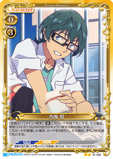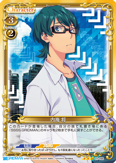 | このカードが登場した場合、自分の捨て札置き場にある『SSSS.GRIDMAN』のキャラを2枚まで手札に戻すことができる。 | ||