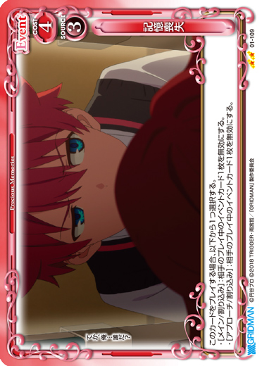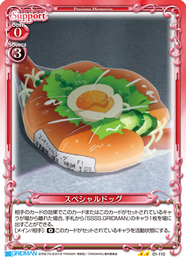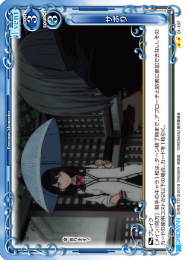 | 相手のカードの効果でこのカードまたはこのカードがセットされているキャラが場から離れた場合、手札から『SSSS.GRIDMAN』のキャラ1枚を場に出すことができる。[メイン/相手]:《0》このカードがセットされているキャラを活動状態にする。 | ||