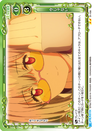 | 〔ブレイク〕[メイン/両方]:このターン、このターンの間に場に出た全てのキャラは、アプローチできない。ターン終了時にカードを1枚引く。 | ||