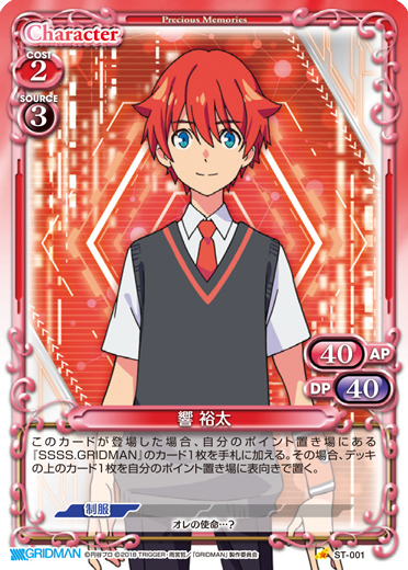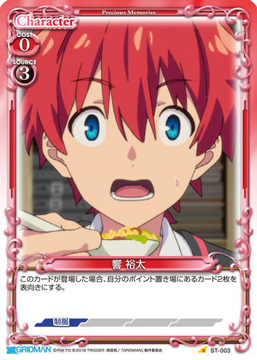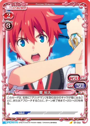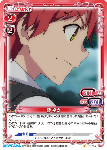 | このカードが、自分の「響 裕太」がいる状態で登場した場合、カードを1枚引く。このカードは、名称に「グリッドマン」を含む自分のキャラがいる場合、+20/+20を得る。 | ||