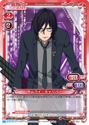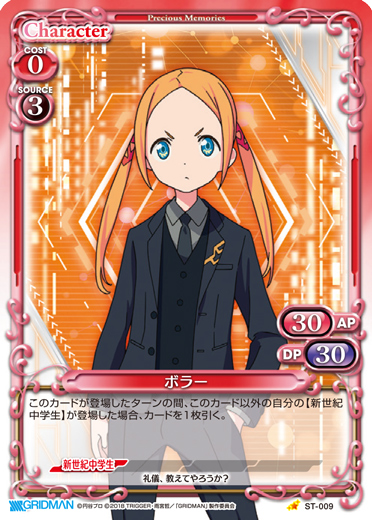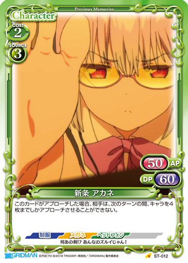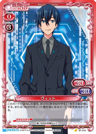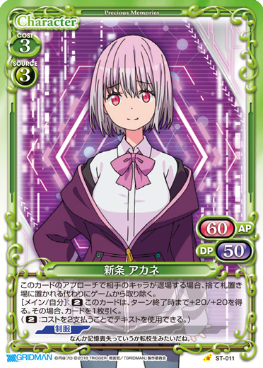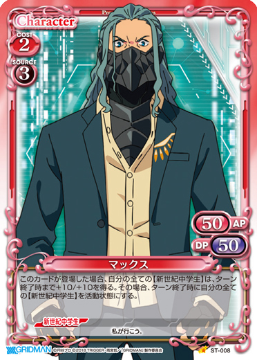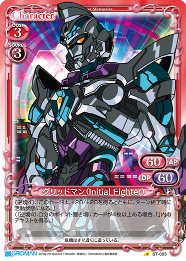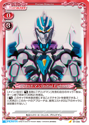 | [メイン/自分]:《休》名称に「グリッドマン」を含む自分のキャラ1枚は、ターン終了時まで〔天然2〕を得る。(《休》:このキャラを休息状態にすることでテキストを使用できる。)(〔天然2〕:このカードのアプローチは、使用コストが2以下のキャラには妨害されない。) | ||