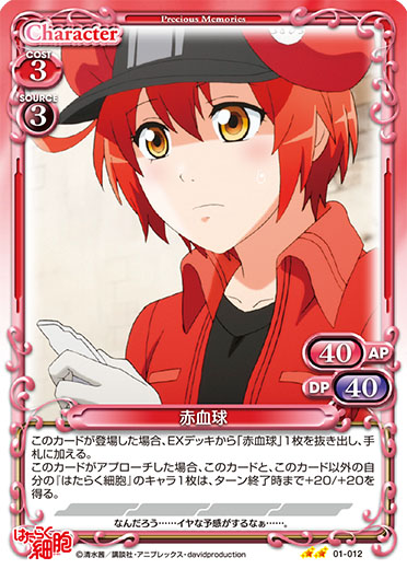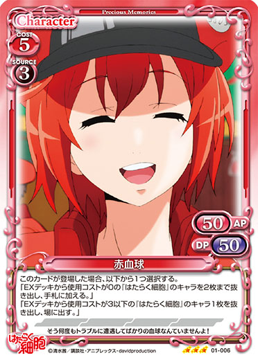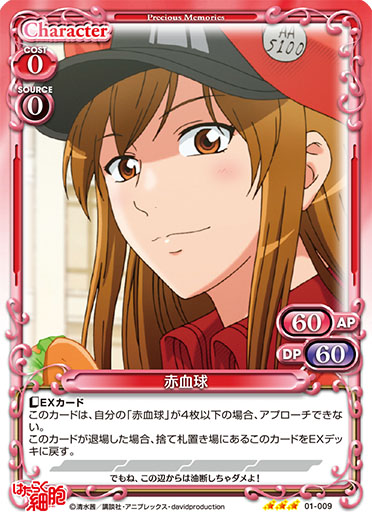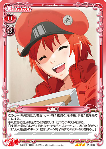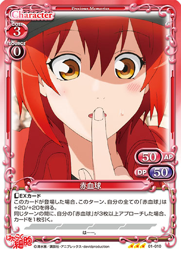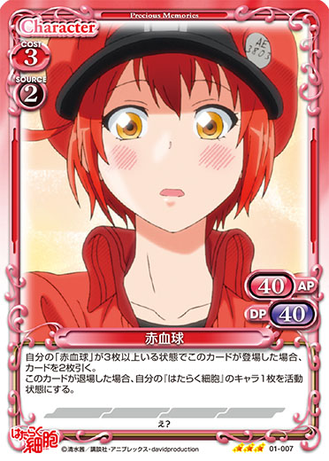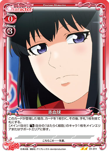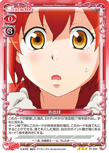 | このカードが登場した場合、EXデッキから「赤血球」1枚を抜き出し、手札に加える。このカードがアプローチした場合、このカードと、このカード以外の自分の『はたらく細胞』のキャラ1枚は、ターン終了時まで+20/+20を得る。 | ||