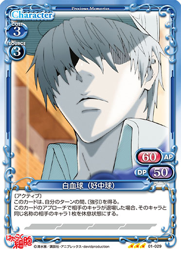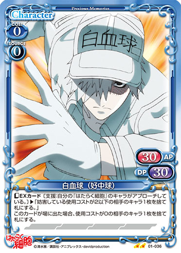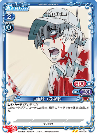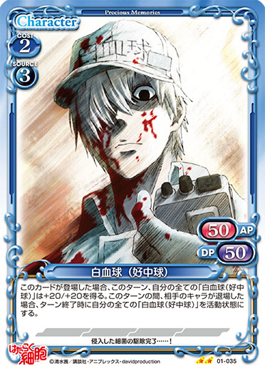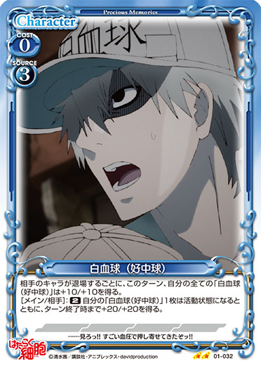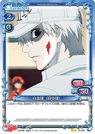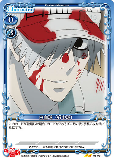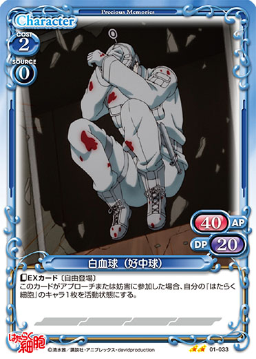 | このカードが登場した場合、このターン、自分の全ての「白血球(好中球)」は+20/+20を得る。このターンの間、相手のキャラが退場した場合、ターン終了時に自分の全ての「白血球(好中球)」を活動状態にする。 | ||
