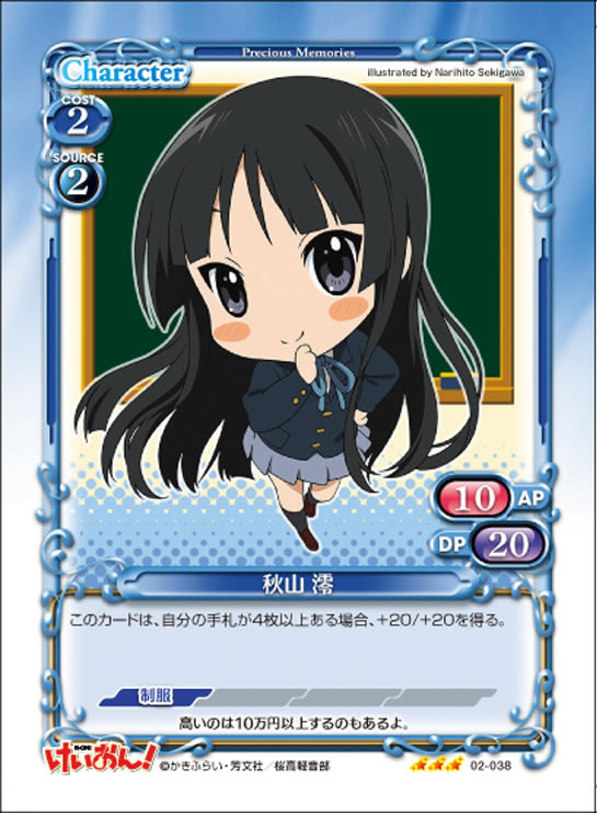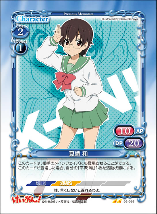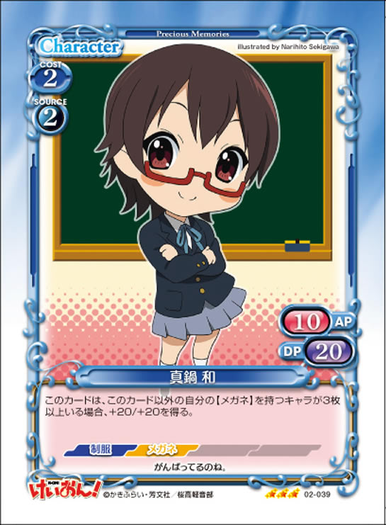 | このカードは、このカード以外の自分の【メガネ】を持つキャラが3枚以上いる場合、+20/+20を得る。 | ||
