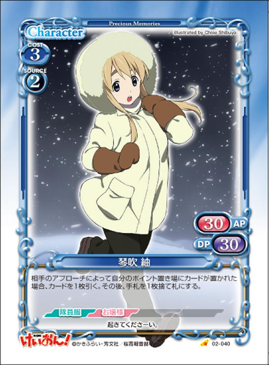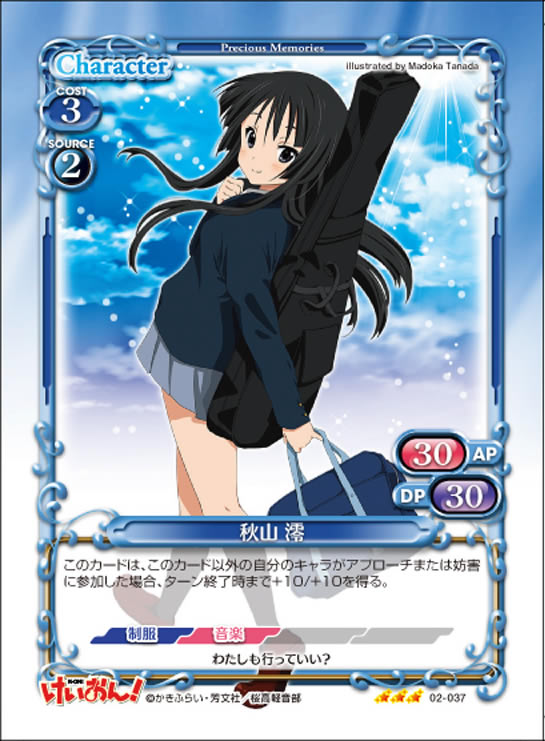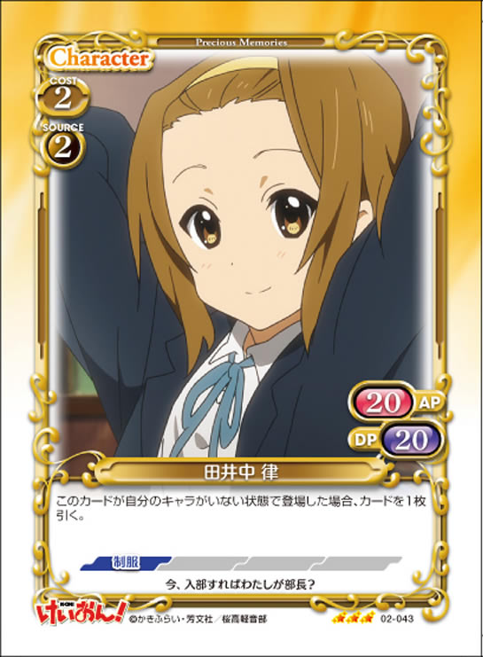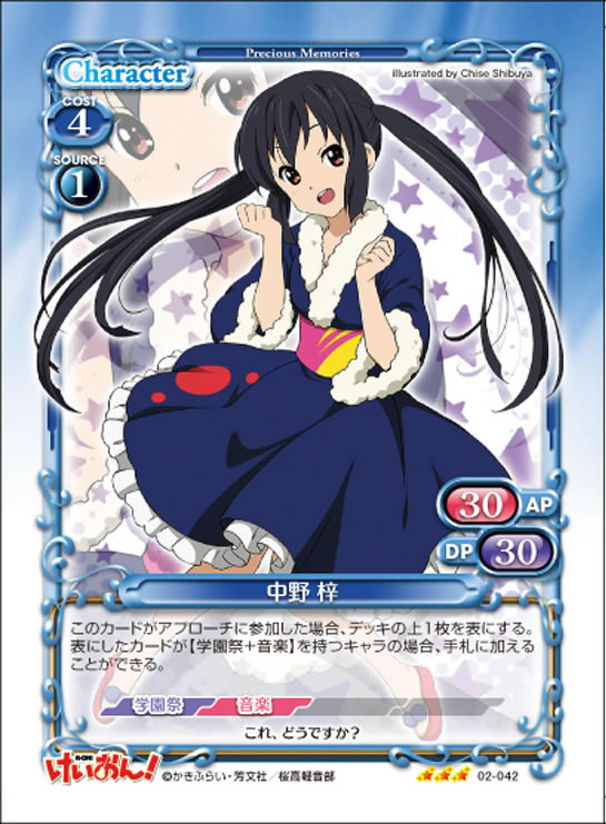 | このカードがアプローチに参加した場合、デッキの上1枚を表にする。表にしたカードが【学園祭+音楽】を持つキャラの場合、手札に加えることができる。 | ||