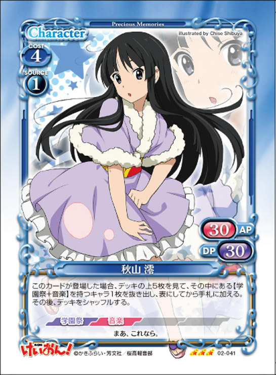 | このカードが登場した場合、デッキの上5枚を見て、その中にある【学園祭+音楽】を持つキャラ1枚を抜き出し、表にしてから手札に加える。その後、デッキをシャッフルする。 | ||