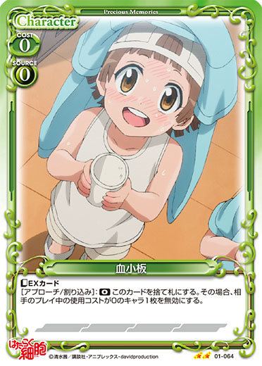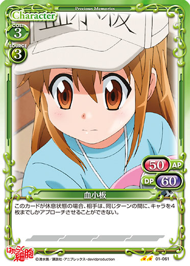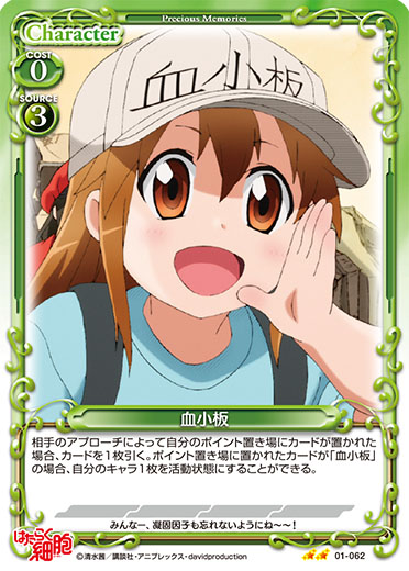 | 相手のアプローチによって自分のポイント置き場にカードが置かれた場合、カードを1枚引く。ポイント置き場に置かれたカードが「血小板」の場合、自分のキャラ1枚を活動状態にすることができる。 | ||