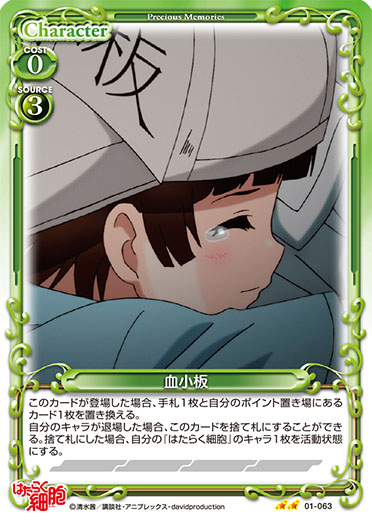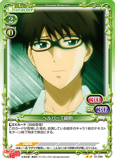 | このカードが登場した場合、手札1枚と自分のポイント置き場にあるカード1枚を置き換える。自分のキャラが退場した場合、このカードを捨て札にすることができる。捨て札にした場合、自分の『はたらく細胞』のキャラ1枚を活動状態にする。 | ||