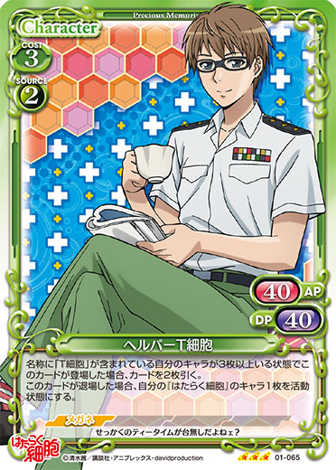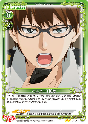 | このカードが登場した場合、デッキの中を全て見て、その中から名称に「T細胞」が含まれているキャラ1枚を抜き出し、表にしてから手札に加える。その後、デッキをシャッフルする。 | ||