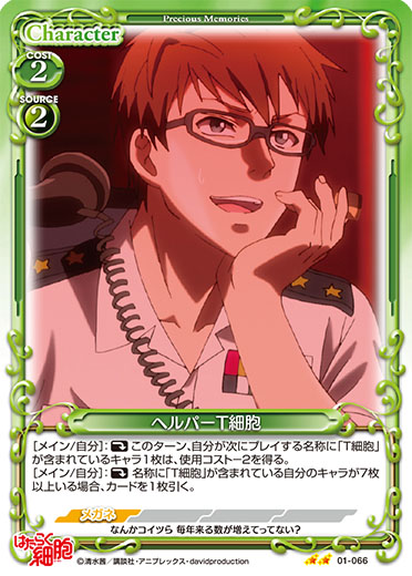 | [メイン/自分]:《休》このターン、自分が次にプレイする名称に「T細胞」が含まれているキャラ1枚は、使用コスト-2を得る。[メイン/自分]:《休》名称に「T細胞」が含まれている自分のキャラが7枚以上いる場合、カードを1枚引く。 | ||