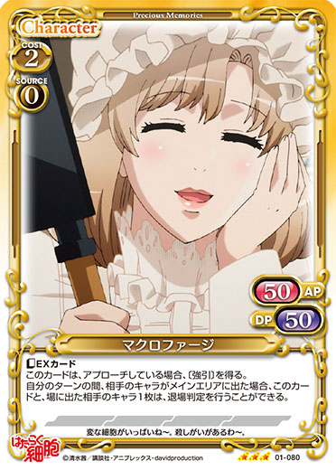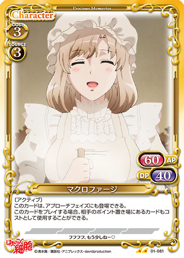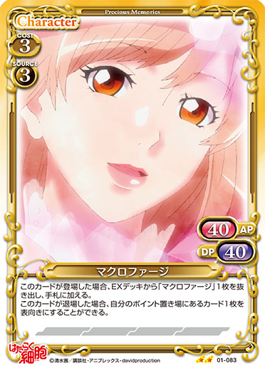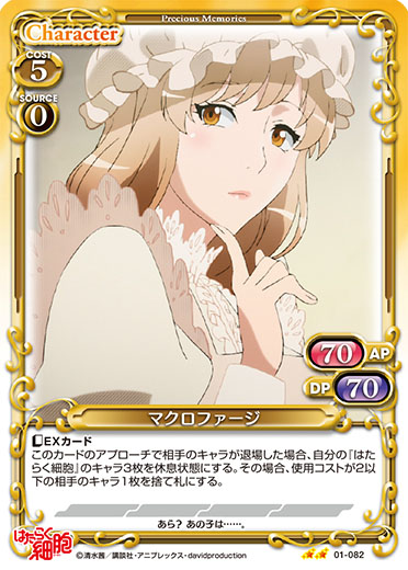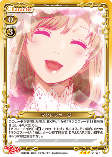 | このカードが登場した場合、EXデッキから「マクロファージ」1枚を抜き出し、手札に加える。[アプローチ/自分]:《0》このカードを捨て札にする。その場合、自分の「マクロファージ」1枚は、ターン終了時まで、DPよりAPが高い相手のキャラには妨害されない。 | ||