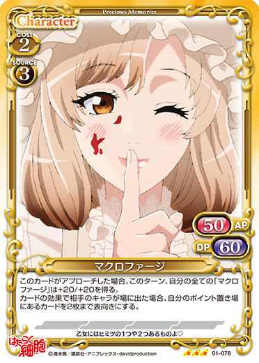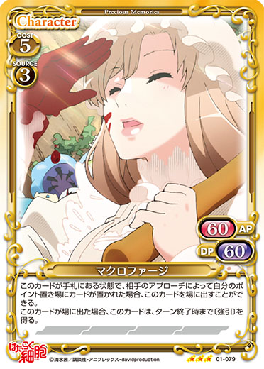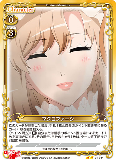 | このカードがアプローチした場合、このターン、自分の全ての「マクロファージ」は+20/+20を得る。カードの効果で相手のキャラが場に出た場合、自分のポイント置き場にあるカードを2枚まで表向きにする。 | ||