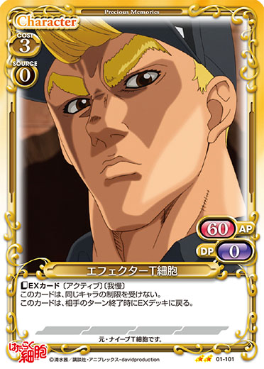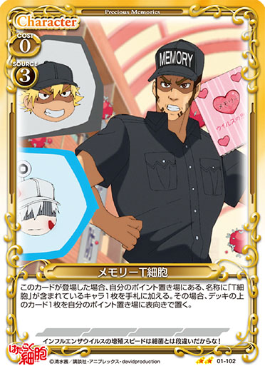 | このカードが登場した場合、自分のポイント置き場にある、名称に「T細胞」が含まれているキャラ1枚を手札に加える。その場合、デッキの上のカード1枚を自分のポイント置き場に表向きで置く。 | ||