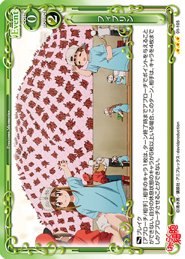 | 〔ブレイク〕[アプローチ/相手]:相手のキャラ1枚は、ターン終了時までアプローチでポイントを与えることができない。自分の休息状態のキャラが5枚以上いる場合、このターン、相手は、キャラを4枚までしかアプローチさせることができない。 | ||