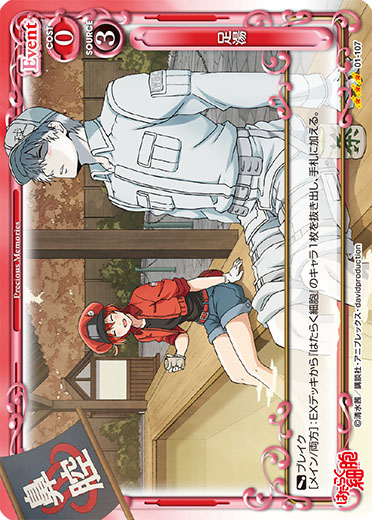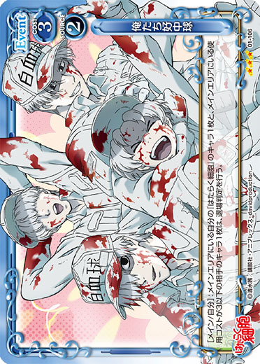 | [メイン/自分]:メインエリアにいる自分の『はたらく細胞』のキャラ1枚と、メインエリアにいる使用コストが3以下の相手のキャラ1枚は、退場判定を行う。 | ||