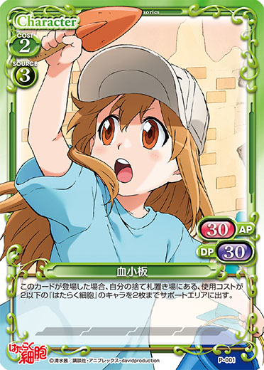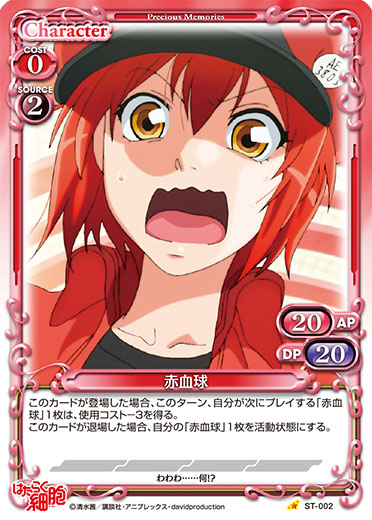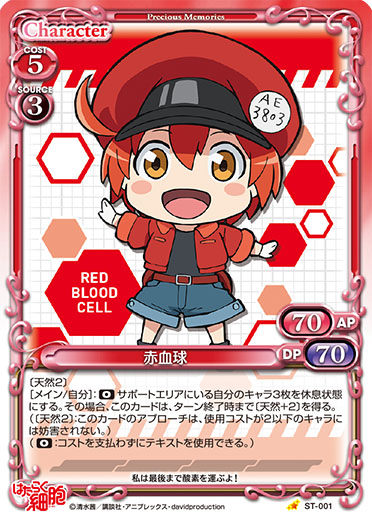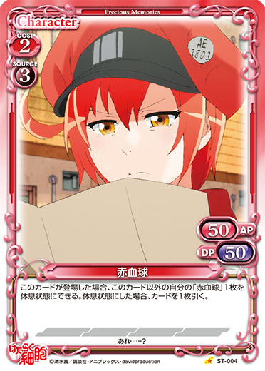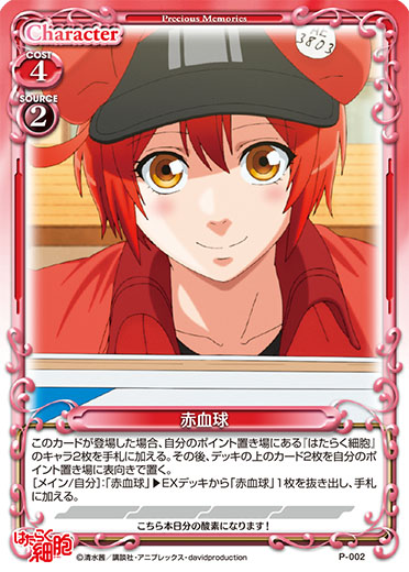 | このカードが登場した場合、自分のポイント置き場にある『はたらく細胞』のキャラ2枚を手札に加える。その後、デッキの上のカード2枚を自分のポイント置き場に表向きで置く。[メイン/自分]:「赤血球」▶EXデッキから「赤血球」1枚を抜き出し、手札に加える。 | ||