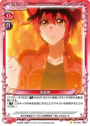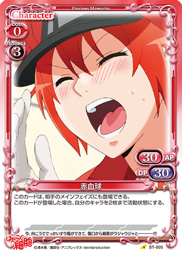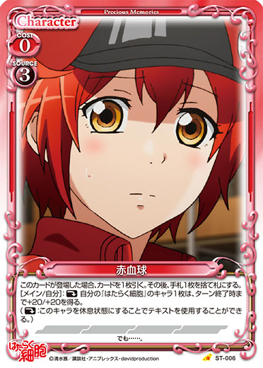 | このカードが登場した場合、このターン、自分が次にプレイする「赤血球」1枚は、使用コスト-3を得る。このカードが退場した場合、自分の「赤血球」1枚を活動状態にする。 | ||