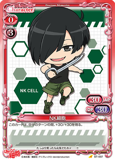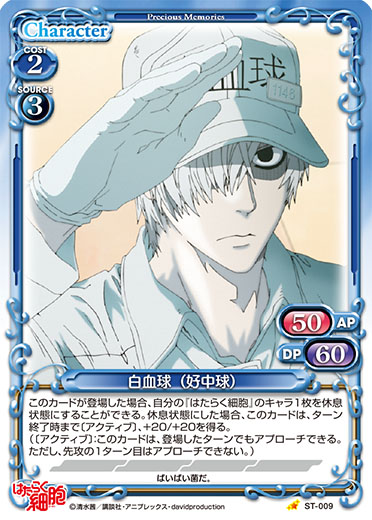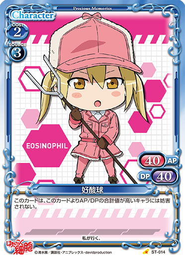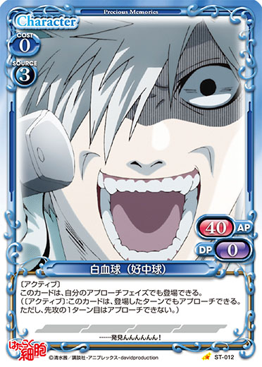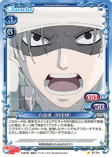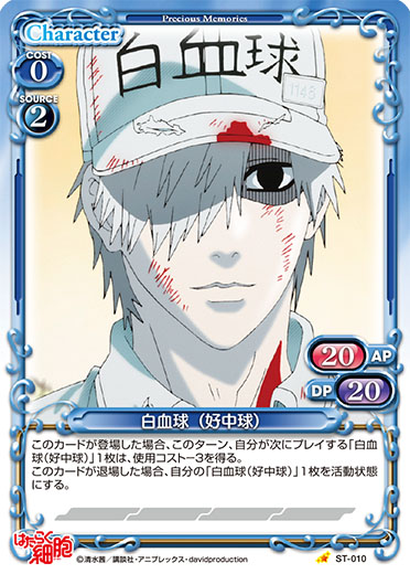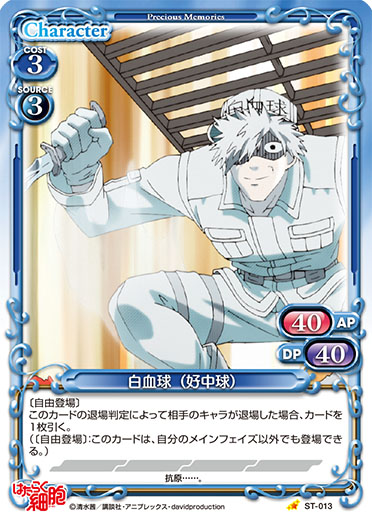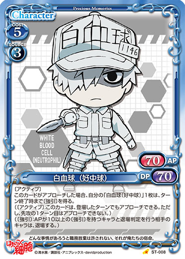 | このカードが登場した場合、このターン、自分が次にプレイする「白血球(好中球)」1枚は、使用コスト-3を得る。このカードが退場した場合、自分の「白血球(好中球)」1枚を活動状態にする。 | ||