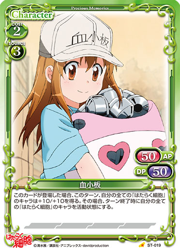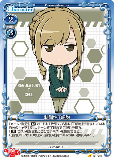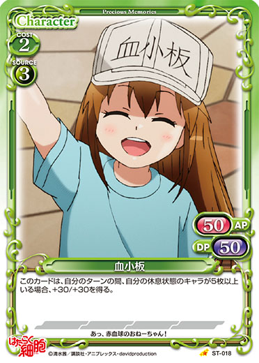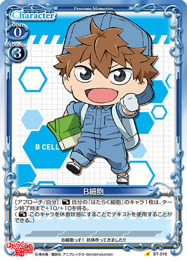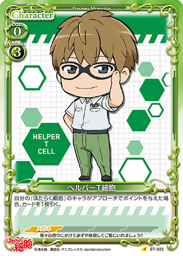 | [アプローチ/自分]:《休》自分の『はたらく細胞』のキャラ1枚は、ターン終了時まで+10/+10を得る。(《休》:このキャラを休息状態にすることでテキストを使用することができる。) | ||