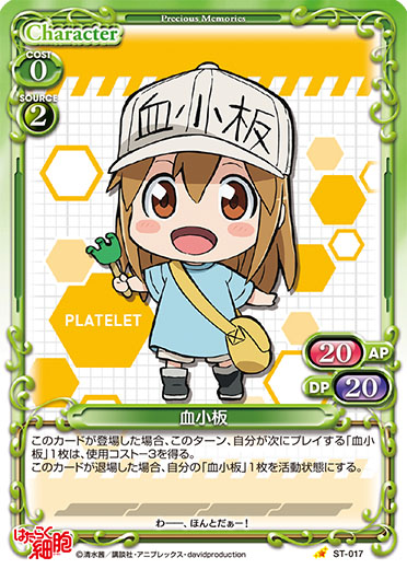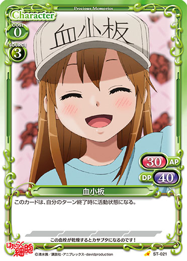 | このカードが登場した場合、このターン、自分が次にプレイする「血小板」1枚は、使用コスト-3を得る。このカードが退場した場合、自分の「血小板」1枚を活動状態にする。 | ||
