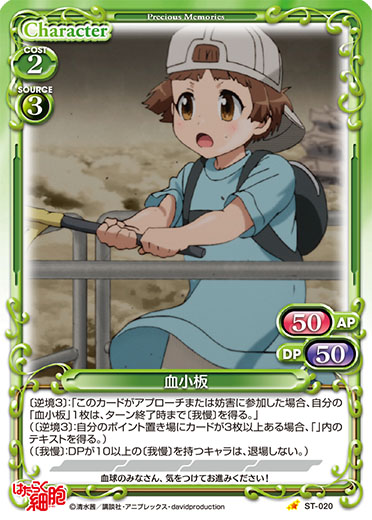 | 〔逆境3〕:「このカードがアプローチまたは妨害に参加した場合、自分の「血小板」1枚は、ターン終了時まで〔我慢〕を得る。」(〔逆境3〕:自分のポイント置き場にカードが3枚以上ある場合、「」内のテキストを得る。)(〔我慢〕:DPが10以上の〔我慢〕を持つキャラは、退場しない。) | ||