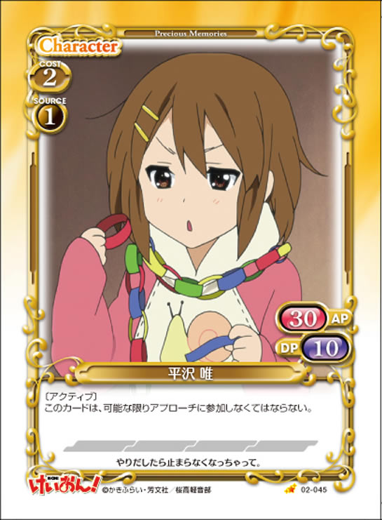 | このカードが登場した場合、デッキの上のカード1枚を表にする。表にしたカードが【ジャージ】を持つキャラの場合、そのキャラを手札に加えることができる。 | ||