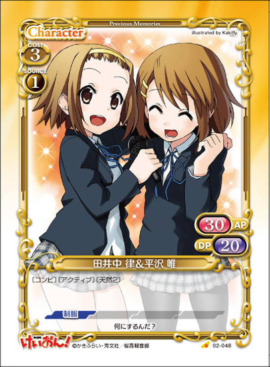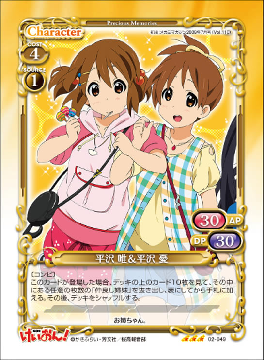 | 〔コンビ〕このカードが登場した場合、デッキの上のカード10枚を見て、その中にある任意の枚数の「仲良し姉妹」を抜き出し、表にしてから手札に加える。その後、デッキをシャッフルする。 | ||