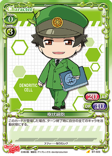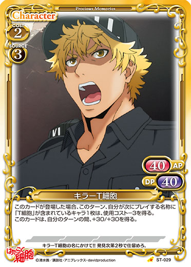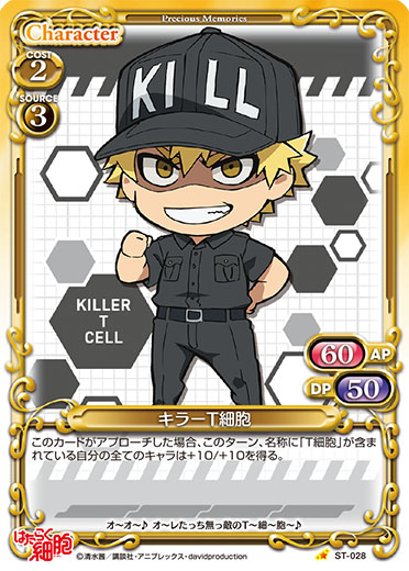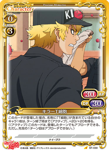 | このカードが登場した場合、名称に「T細胞」が含まれている自分のキャラ1枚は、ターン終了時まで〔アクティブ〕、+20/+20を得る。(〔アクティブ〕:このカードは、登場したターンでもアプローチできる。ただし、先攻の1ターン目はアプローチできない。) | ||