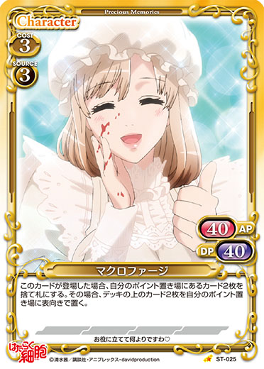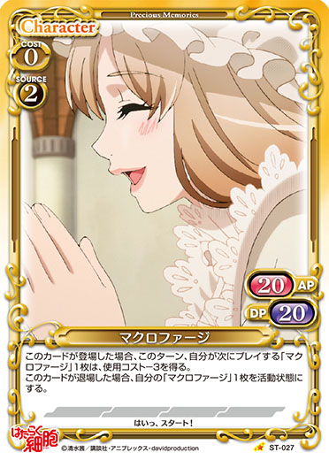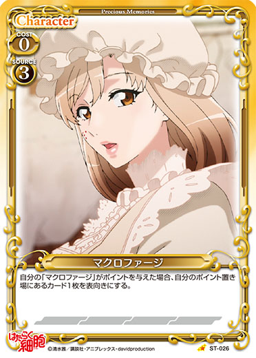 | このカードが登場した場合、このターン、自分が次にプレイする「マクロファージ」1枚は、使用コスト-3を得る。 このカードが退場した場合、自分の「マクロファージ」1枚を活動状態にする。 | ||