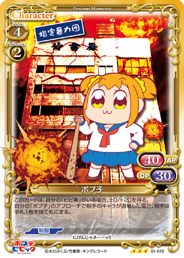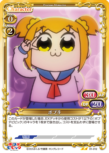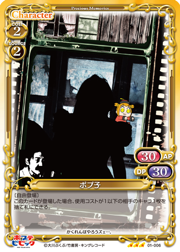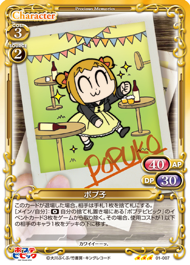 | このカードは、自分の「ピピ美」がいる場合、±0/+20を得る。自分の「ポプ子」のアプローチで相手のキャラが退場した場合、相手は手札1枚を捨て札にする。 | ||