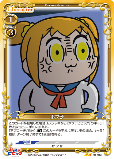 | このカードが退場した場合、相手は手札1枚を捨て札にする。[メイン/自分]:《0》自分の捨て札置き場にある『ポプテピピック』のイベントカード3枚をゲームから取り除く。その場合、使用コストが1以下の相手のキャラ1枚をデッキの下に移す。 | ||