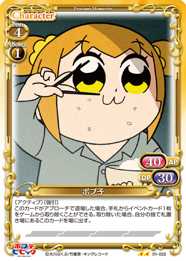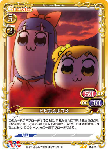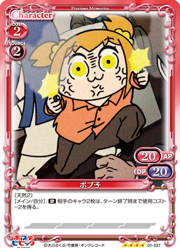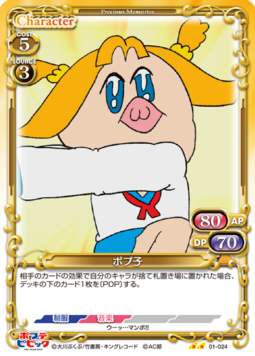 | 〔コンビ〕このカードがアプローチするごとに、手札から「ポプ子」1枚と「ピピ美」1枚を捨て札にできる。捨て札にした場合、このカードは活動状態になるとともに、このターン、もう一度アプローチできる。 | ||