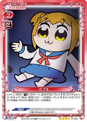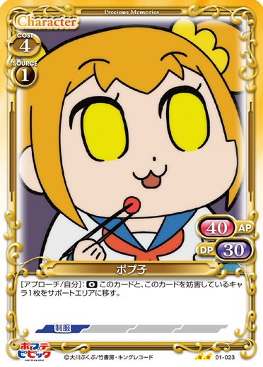| [メイン/両方]:《休》このターン、自分が次にプレイする『ポプテピピック』のキャラ1枚は、使用コスト-1を得る。プレイするキャラが「ポプ子」の場合、代わりに使用コスト-2を得る。 | ||