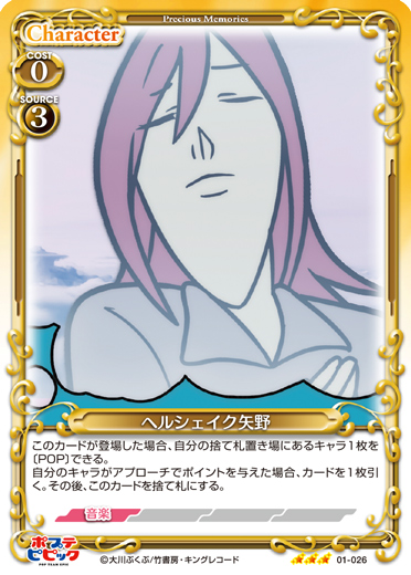 | このカードが登場した場合、自分の捨て札置き場にあるキャラ1枚を〔POP〕できる。自分のキャラがアプローチでポイントを与えた場合、カードを1枚引く。その後、このカードを捨て札にする。 | ||