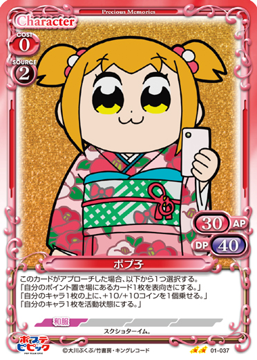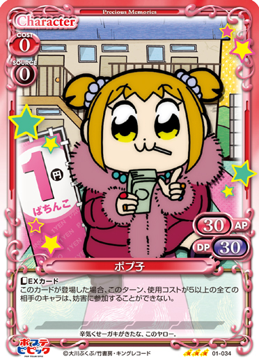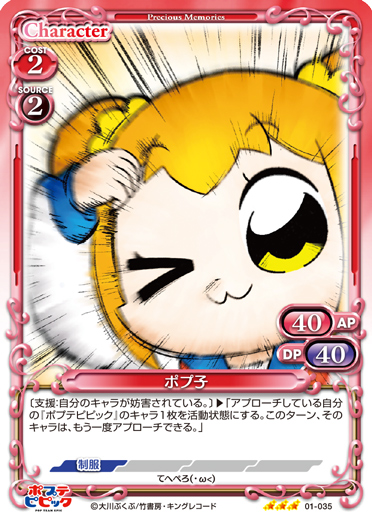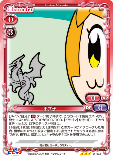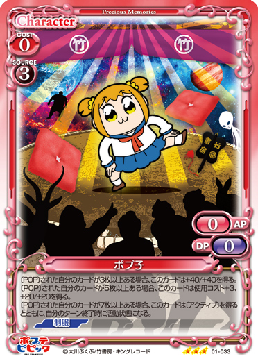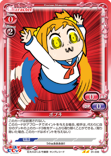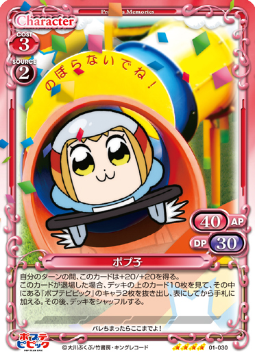 | 自分のターンの間、このカードは+20/+20を得る。このカードが退場した場合、デッキの上のカード10枚を見て、その中にある『ポプテピピック』のキャラ2枚を抜き出し、表にしてから手札に加える。その後、デッキをシャッフルする。 | ||