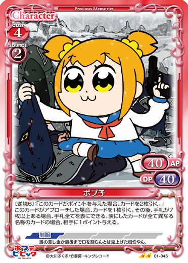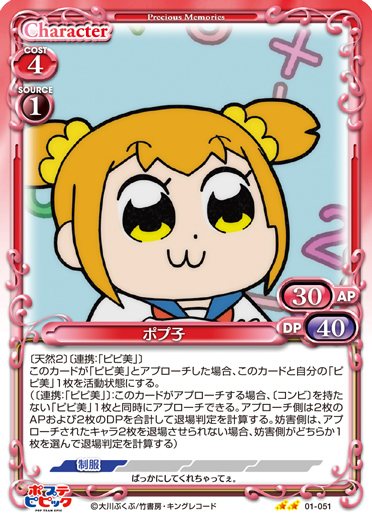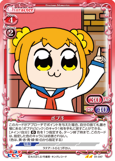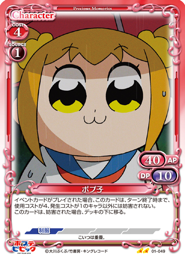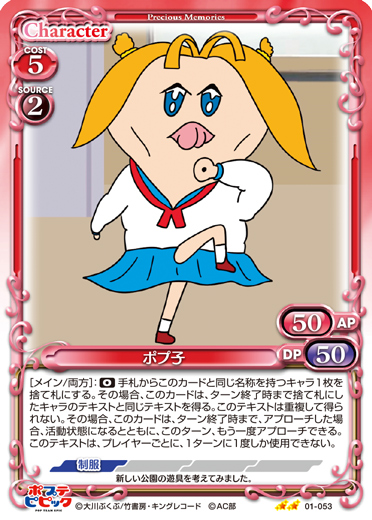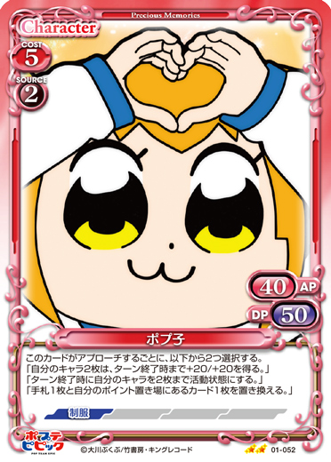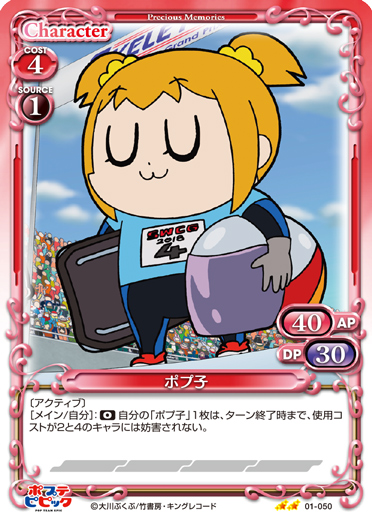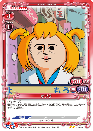| 〔アクティブ〕[メイン/自分]:《0》自分の「ポプ子」1枚は、ターン終了時まで、使用コストが2と4のキャラには妨害されない。 | ||
