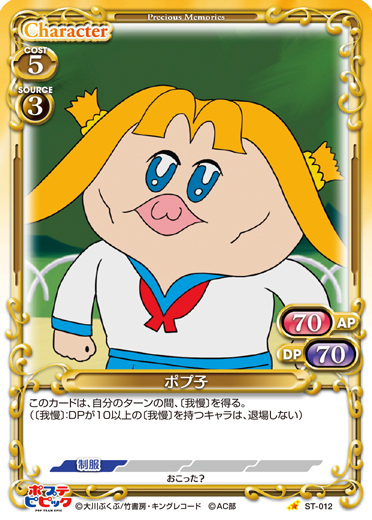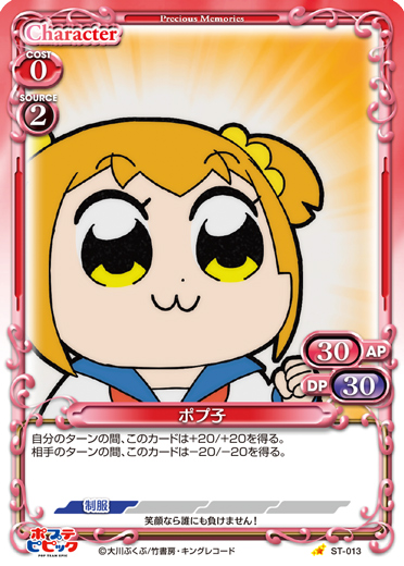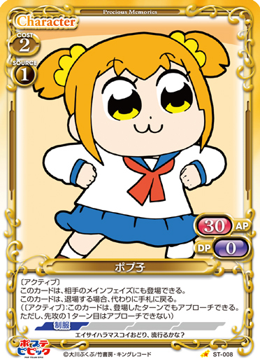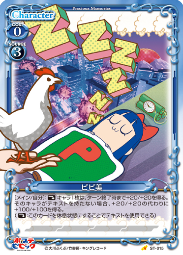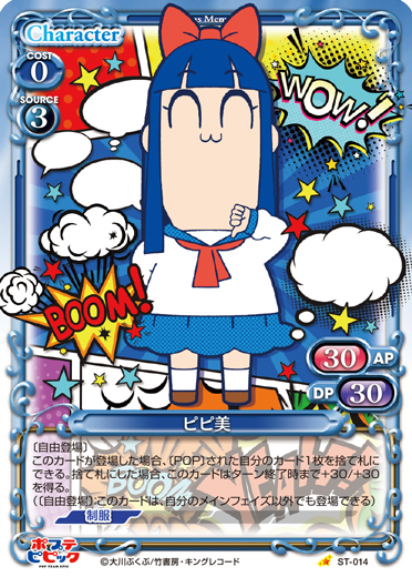 | 〔自由登場〕このカードが登場した場合、〔POP〕された自分のカード1枚を捨て札にできる。捨て札にした場合、このカードはターン終了時まで+30/+30を得る。(〔自由登場〕:このカードは、自分のメインフェイズ以外でも登場できる) | ||
