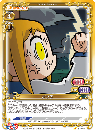| 〔アクティブ〕このカードが登場した場合、相手のキャラ1枚を休息状態にする。(〔アクティブ〕:このカードは、登場したターンでもアプローチできる。ただし、先攻の1ターン目はアプローチできない) | ||